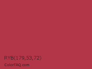 RYB 179,53,72 Color is a normal red color and the nearest color is Amaranth Purple #ab274f. Hex code #b33548 and RGB value is rgb(179,53,72). In RGB color space, this color is composed of 70% red, 21% green, 28% blue, In CMYK color space, this color is composed of 0% cyan, 70% magenta, 60% yellow , 30% black , In HSL color space, this color has a hue angle of 351° , 54% saturation and 45% lightness.