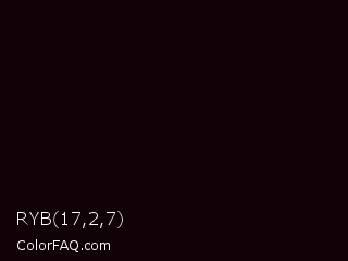 RYB 17,2,7 Color is a almost black rose color and the nearest color is Diesel #130000. Hex code #110207 and RGB value is rgb(17,2,7). In RGB color space, this color is composed of 7% red, 1% green, 3% blue, In CMYK color space, this color is composed of 0% cyan, 88% magenta, 59% yellow , 93% black , In HSL color space, this color has a hue angle of 340° , 79% saturation and 4% lightness.