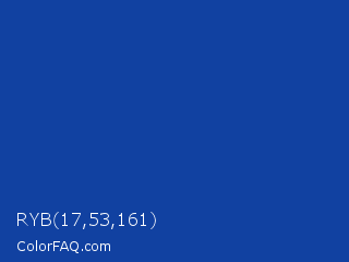 RYB 17,53,161 Color is a normal blue color and the nearest color is Egyptian Blue #1034a6. Hex code #1141a1 and RGB value is rgb(17,65,161). In RGB color space, this color is composed of 7% red, 25% green, 63% blue, In CMYK color space, this color is composed of 89% cyan, 60% magenta, 0% yellow , 37% black , In HSL color space, this color has a hue angle of 220° , 81% saturation and 35% lightness.