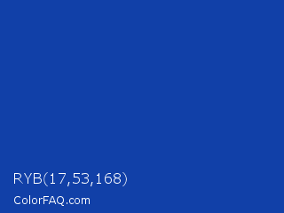 RYB 17,53,168 Color is a normal blue color and the nearest color is Egyptian Blue #1034a6. Hex code #1140a8 and RGB value is rgb(17,64,168). In RGB color space, this color is composed of 7% red, 25% green, 66% blue, In CMYK color space, this color is composed of 90% cyan, 62% magenta, 0% yellow , 34% black , In HSL color space, this color has a hue angle of 221° , 82% saturation and 36% lightness.