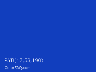 RYB 17,53,190 Color is a normal blue color and the nearest color is Persian Blue #1c39bb. Hex code #113ebe and RGB value is rgb(17,62,190). In RGB color space, this color is composed of 7% red, 24% green, 75% blue, In CMYK color space, this color is composed of 91% cyan, 67% magenta, 0% yellow , 25% black , In HSL color space, this color has a hue angle of 224° , 84% saturation and 41% lightness.