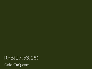 RYB 17,53,28 Color is a very dark lime color and the nearest color is Turtle Green #2a380b. Hex code #2a3511 and RGB value is rgb(42,53,17). In RGB color space, this color is composed of 16% red, 21% green, 7% blue, In CMYK color space, this color is composed of 21% cyan, 0% magenta, 68% yellow , 79% black , In HSL color space, this color has a hue angle of 78° , 51% saturation and 14% lightness.