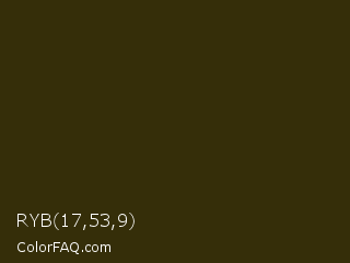 RYB 17,53,9 Color is a very dark yellow color and the nearest color is Brown Tumbleweed #37290e. Hex code #352e09 and RGB value is rgb(53,46,9). In RGB color space, this color is composed of 21% red, 18% green, 4% blue, In CMYK color space, this color is composed of 0% cyan, 13% magenta, 83% yellow , 79% black , In HSL color space, this color has a hue angle of 50° , 71% saturation and 12% lightness.