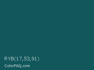 RYB 17,53,91 Color is a very dark cyan color and the nearest color is Deep Sea Green #095859. Hex code #11575b and RGB value is rgb(17,87,91). In RGB color space, this color is composed of 7% red, 34% green, 36% blue, In CMYK color space, this color is composed of 81% cyan, 4% magenta, 0% yellow , 64% black , In HSL color space, this color has a hue angle of 183° , 69% saturation and 21% lightness.