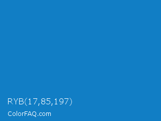 RYB 17,85,197 Color is a normal blue color and the nearest color is Cyan Cornflower Blue #188bc2. Hex code #117ec5 and RGB value is rgb(17,126,197). In RGB color space, this color is composed of 7% red, 49% green, 77% blue, In CMYK color space, this color is composed of 91% cyan, 36% magenta, 0% yellow , 23% black , In HSL color space, this color has a hue angle of 204° , 84% saturation and 42% lightness.