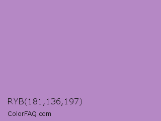 RYB 181,136,197 Color is a light purple color and the nearest color is African Violet #b284be. Hex code #b588c5 and RGB value is rgb(181,136,197). In RGB color space, this color is composed of 71% red, 53% green, 77% blue, In CMYK color space, this color is composed of 8% cyan, 31% magenta, 0% yellow , 23% black , In HSL color space, this color has a hue angle of 284° , 34% saturation and 65% lightness.
