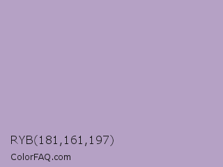 RYB 181,161,197 Color is a light purple color and the nearest color is London Hue #bea6c3. Hex code #b5a1c5 and RGB value is rgb(181,161,197). In RGB color space, this color is composed of 71% red, 63% green, 77% blue, In CMYK color space, this color is composed of 8% cyan, 18% magenta, 0% yellow , 23% black , In HSL color space, this color has a hue angle of 273° , 24% saturation and 70% lightness.