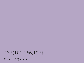 RYB 181,166,197 Color is a light violet color and the nearest color is London Hue #bea6c3. Hex code #b5a6c5 and RGB value is rgb(181,166,197). In RGB color space, this color is composed of 71% red, 65% green, 77% blue, In CMYK color space, this color is composed of 8% cyan, 16% magenta, 0% yellow , 23% black , In HSL color space, this color has a hue angle of 269° , 21% saturation and 71% lightness.