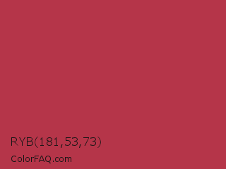 RYB 181,53,73 Color is a normal red color and the nearest color is Amaranth Purple #ab274f. Hex code #b53549 and RGB value is rgb(181,53,73). In RGB color space, this color is composed of 71% red, 21% green, 29% blue, In CMYK color space, this color is composed of 0% cyan, 71% magenta, 60% yellow , 29% black , In HSL color space, this color has a hue angle of 351° , 55% saturation and 46% lightness.