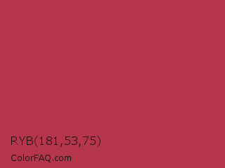 RYB 181,53,75 Color is a normal red color and the nearest color is Dingy Dungeon #c53151. Hex code #b5354b and RGB value is rgb(181,53,75). In RGB color space, this color is composed of 71% red, 21% green, 29% blue, In CMYK color space, this color is composed of 0% cyan, 71% magenta, 59% yellow , 29% black , In HSL color space, this color has a hue angle of 350° , 55% saturation and 46% lightness.