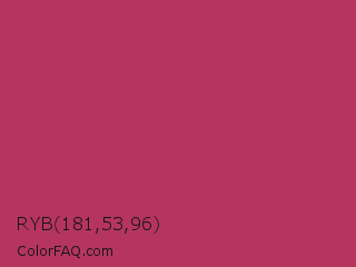 RYB 181,53,96 Color is a normal rose color and the nearest color is Rich Maroon #b03060. Hex code #b53560 and RGB value is rgb(181,53,96). In RGB color space, this color is composed of 71% red, 21% green, 38% blue, In CMYK color space, this color is composed of 0% cyan, 71% magenta, 47% yellow , 29% black , In HSL color space, this color has a hue angle of 340° , 55% saturation and 46% lightness.