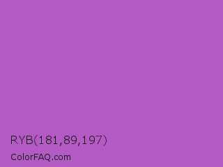 RYB 181,89,197 Color is a normal purple color and the nearest color is Fuchsia Pink #c154c1. Hex code #b559c5 and RGB value is rgb(181,89,197). In RGB color space, this color is composed of 71% red, 35% green, 77% blue, In CMYK color space, this color is composed of 8% cyan, 55% magenta, 0% yellow , 23% black , In HSL color space, this color has a hue angle of 291° , 48% saturation and 56% lightness.