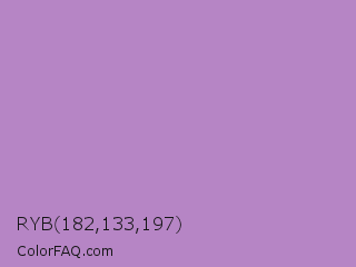 RYB 182,133,197 Color is a light purple color and the nearest color is African Violet #b284be. Hex code #b685c5 and RGB value is rgb(182,133,197). In RGB color space, this color is composed of 71% red, 52% green, 77% blue, In CMYK color space, this color is composed of 8% cyan, 32% magenta, 0% yellow , 23% black , In HSL color space, this color has a hue angle of 286° , 36% saturation and 65% lightness.