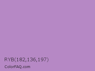 RYB 182,136,197 Color is a light purple color and the nearest color is African Violet #b284be. Hex code #b688c5 and RGB value is rgb(182,136,197). In RGB color space, this color is composed of 71% red, 53% green, 77% blue, In CMYK color space, this color is composed of 8% cyan, 31% magenta, 0% yellow , 23% black , In HSL color space, this color has a hue angle of 285° , 34% saturation and 65% lightness.