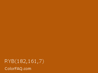 RYB 182,161,7 Color is a normal orange color and the nearest color is Pumpkin Skin #b1610b. Hex code #b65907 and RGB value is rgb(182,89,7). In RGB color space, this color is composed of 71% red, 35% green, 3% blue, In CMYK color space, this color is composed of 0% cyan, 51% magenta, 96% yellow , 29% black , In HSL color space, this color has a hue angle of 28° , 93% saturation and 37% lightness.