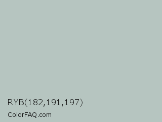 RYB 182,191,197 Color is a light green color and the nearest color is Powder Ash #bcc9c2. Hex code #b6c5c0 and RGB value is rgb(182,197,192). In RGB color space, this color is composed of 71% red, 77% green, 75% blue, In CMYK color space, this color is composed of 8% cyan, 0% magenta, 3% yellow , 23% black , In HSL color space, this color has a hue angle of 160° , 11% saturation and 74% lightness.