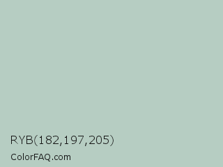 RYB 182,197,205 Color is a light green color and the nearest color is Gum Leaf #b6d3bf. Hex code #b6cdc2 and RGB value is rgb(182,205,194). In RGB color space, this color is composed of 71% red, 80% green, 76% blue, In CMYK color space, this color is composed of 11% cyan, 0% magenta, 5% yellow , 20% black , In HSL color space, this color has a hue angle of 151° , 19% saturation and 76% lightness.
