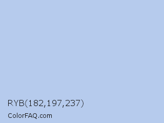 RYB 182,197,237 Color is a very light blue color and the nearest color is Spindle #b6d1ea. Hex code #b6cbed and RGB value is rgb(182,203,237). In RGB color space, this color is composed of 71% red, 80% green, 93% blue, In CMYK color space, this color is composed of 23% cyan, 14% magenta, 0% yellow , 7% black , In HSL color space, this color has a hue angle of 217° , 60% saturation and 82% lightness.