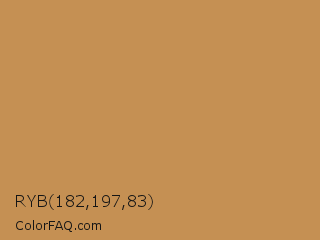 RYB 182,197,83 Color is a normal orange color and the nearest color is Aztec Gold #c39953. Hex code #c59053 and RGB value is rgb(197,144,83). In RGB color space, this color is composed of 77% red, 56% green, 33% blue, In CMYK color space, this color is composed of 0% cyan, 27% magenta, 58% yellow , 23% black , In HSL color space, this color has a hue angle of 32° , 50% saturation and 55% lightness.