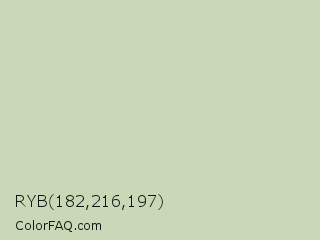 RYB 182,216,197 Color is a light green color and the nearest color is Green Mist #cbd3b0. Hex code #c9d8b6 and RGB value is rgb(201,216,182). In RGB color space, this color is composed of 79% red, 85% green, 71% blue, In CMYK color space, this color is composed of 7% cyan, 0% magenta, 16% yellow , 15% black , In HSL color space, this color has a hue angle of 86° , 30% saturation and 78% lightness.