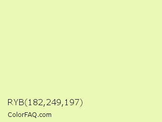 RYB 182,249,197 Color is a very light lime color and the nearest color is Tidal #f1ffad. Hex code #eaf9b6 and RGB value is rgb(234,249,182). In RGB color space, this color is composed of 92% red, 98% green, 71% blue, In CMYK color space, this color is composed of 6% cyan, 0% magenta, 27% yellow , 2% black , In HSL color space, this color has a hue angle of 73° , 85% saturation and 85% lightness.