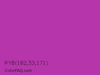 RYB 182,53,171 Color is a normal magenta color and the nearest color is Byzantine #bd33a4. Hex code #b635ab and RGB value is rgb(182,53,171). In RGB color space, this color is composed of 71% red, 21% green, 67% blue, In CMYK color space, this color is composed of 0% cyan, 71% magenta, 6% yellow , 29% black , In HSL color space, this color has a hue angle of 305° , 55% saturation and 46% lightness.