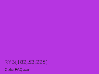 RYB 182,53,225 Color is a normal purple color and the nearest color is Steel Pink #cc33cc. Hex code #b635e1 and RGB value is rgb(182,53,225). In RGB color space, this color is composed of 71% red, 21% green, 88% blue, In CMYK color space, this color is composed of 19% cyan, 76% magenta, 0% yellow , 12% black , In HSL color space, this color has a hue angle of 285° , 74% saturation and 55% lightness.