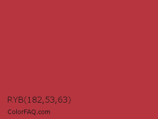 RYB 182,53,63 Color is a normal red color and the nearest color is Well Read #b43332. Hex code #b6353f and RGB value is rgb(182,53,63). In RGB color space, this color is composed of 71% red, 21% green, 25% blue, In CMYK color space, this color is composed of 0% cyan, 71% magenta, 65% yellow , 29% black , In HSL color space, this color has a hue angle of 355° , 55% saturation and 46% lightness.