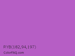 RYB 182,94,197 Color is a normal purple color and the nearest color is Rich Lilac #b666d2. Hex code #b65ec5 and RGB value is rgb(182,94,197). In RGB color space, this color is composed of 71% red, 37% green, 77% blue, In CMYK color space, this color is composed of 8% cyan, 52% magenta, 0% yellow , 23% black , In HSL color space, this color has a hue angle of 291° , 47% saturation and 57% lightness.
