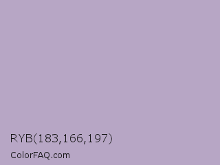 RYB 183,166,197 Color is a light purple color and the nearest color is London Hue #bea6c3. Hex code #b7a6c5 and RGB value is rgb(183,166,197). In RGB color space, this color is composed of 72% red, 65% green, 77% blue, In CMYK color space, this color is composed of 7% cyan, 16% magenta, 0% yellow , 23% black , In HSL color space, this color has a hue angle of 273° , 21% saturation and 71% lightness.