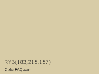 RYB 183,216,167 Color is a light orange color and the nearest color is Akaroa #d4c4a8. Hex code #d8cca7 and RGB value is rgb(216,204,167). In RGB color space, this color is composed of 85% red, 80% green, 65% blue, In CMYK color space, this color is composed of 0% cyan, 6% magenta, 23% yellow , 15% black , In HSL color space, this color has a hue angle of 45° , 39% saturation and 75% lightness.