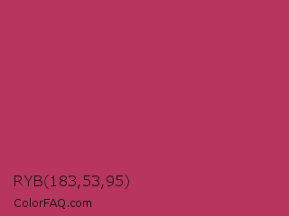 RYB 183,53,95 Color is a normal rose color and the nearest color is Rich Maroon #b03060. Hex code #b7355f and RGB value is rgb(183,53,95). In RGB color space, this color is composed of 72% red, 21% green, 37% blue, In CMYK color space, this color is composed of 0% cyan, 71% magenta, 48% yellow , 28% black , In HSL color space, this color has a hue angle of 341° , 55% saturation and 46% lightness.