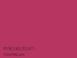 RYB 183,53,97 Color is a normal rose color and the nearest color is Rich Maroon #b03060. Hex code #b73561 and RGB value is rgb(183,53,97). In RGB color space, this color is composed of 72% red, 21% green, 38% blue, In CMYK color space, this color is composed of 0% cyan, 71% magenta, 47% yellow , 28% black , In HSL color space, this color has a hue angle of 340° , 55% saturation and 46% lightness.
