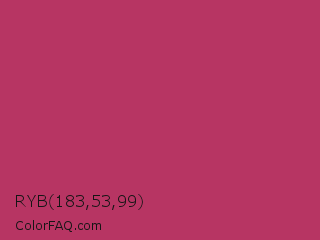 RYB 183,53,99 Color is a normal rose color and the nearest color is Rich Maroon #b03060. Hex code #b73563 and RGB value is rgb(183,53,99). In RGB color space, this color is composed of 72% red, 21% green, 39% blue, In CMYK color space, this color is composed of 0% cyan, 71% magenta, 46% yellow , 28% black , In HSL color space, this color has a hue angle of 339° , 55% saturation and 46% lightness.