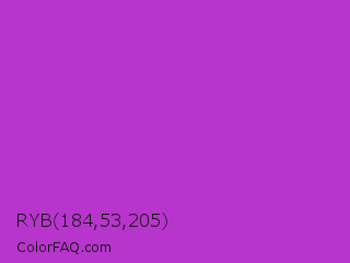 RYB 184,53,205 Color is a normal magenta color and the nearest color is Steel Pink #cc33cc. Hex code #b835cd and RGB value is rgb(184,53,205). In RGB color space, this color is composed of 72% red, 21% green, 80% blue, In CMYK color space, this color is composed of 10% cyan, 74% magenta, 0% yellow , 20% black , In HSL color space, this color has a hue angle of 292° , 60% saturation and 51% lightness.