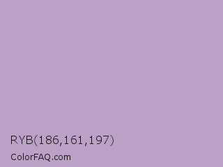 RYB 186,161,197 Color is a light purple color and the nearest color is London Hue #bea6c3. Hex code #baa1c5 and RGB value is rgb(186,161,197). In RGB color space, this color is composed of 73% red, 63% green, 77% blue, In CMYK color space, this color is composed of 6% cyan, 18% magenta, 0% yellow , 23% black , In HSL color space, this color has a hue angle of 282° , 24% saturation and 70% lightness.