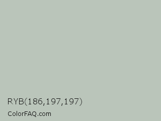 RYB 186,197,197 Color is a light green color and the nearest color is Clay Ash #bdc8b3. Hex code #bac5ba and RGB value is rgb(186,197,186). In RGB color space, this color is composed of 73% red, 77% green, 73% blue, In CMYK color space, this color is composed of 6% cyan, 0% magenta, 6% yellow , 23% black , In HSL color space, this color has a hue angle of 120° , 9% saturation and 75% lightness.