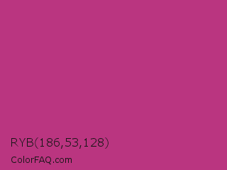 RYB 186,53,128 Color is a normal magenta color and the nearest color is Medium Red Violet #bb3385. Hex code #ba3580 and RGB value is rgb(186,53,128). In RGB color space, this color is composed of 73% red, 21% green, 50% blue, In CMYK color space, this color is composed of 0% cyan, 72% magenta, 31% yellow , 27% black , In HSL color space, this color has a hue angle of 326° , 56% saturation and 47% lightness.