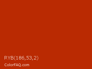 RYB 186,53,2 Color is a normal red color and the nearest color is International Orange Engineering #ba160c. Hex code #ba2a02 and RGB value is rgb(186,42,2). In RGB color space, this color is composed of 73% red, 16% green, 1% blue, In CMYK color space, this color is composed of 0% cyan, 77% magenta, 99% yellow , 27% black , In HSL color space, this color has a hue angle of 13° , 98% saturation and 37% lightness.