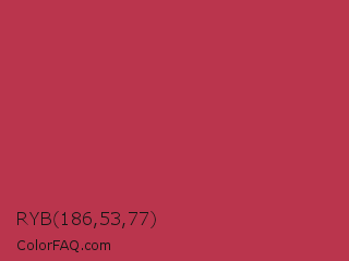 RYB 186,53,77 Color is a normal red color and the nearest color is Dingy Dungeon #c53151. Hex code #ba354d and RGB value is rgb(186,53,77). In RGB color space, this color is composed of 73% red, 21% green, 30% blue, In CMYK color space, this color is composed of 0% cyan, 72% magenta, 59% yellow , 27% black , In HSL color space, this color has a hue angle of 349° , 56% saturation and 47% lightness.