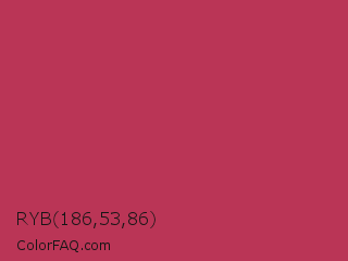 RYB 186,53,86 Color is a normal red color and the nearest color is Dingy Dungeon #c53151. Hex code #ba3556 and RGB value is rgb(186,53,86). In RGB color space, this color is composed of 73% red, 21% green, 34% blue, In CMYK color space, this color is composed of 0% cyan, 72% magenta, 54% yellow , 27% black , In HSL color space, this color has a hue angle of 345° , 56% saturation and 47% lightness.