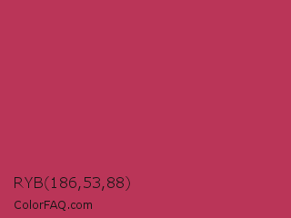 RYB 186,53,88 Color is a normal rose color and the nearest color is Dingy Dungeon #c53151. Hex code #ba3558 and RGB value is rgb(186,53,88). In RGB color space, this color is composed of 73% red, 21% green, 35% blue, In CMYK color space, this color is composed of 0% cyan, 72% magenta, 53% yellow , 27% black , In HSL color space, this color has a hue angle of 344° , 56% saturation and 47% lightness.