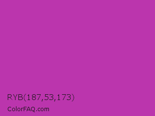 RYB 187,53,173 Color is a normal magenta color and the nearest color is Byzantine #bd33a4. Hex code #bb35ad and RGB value is rgb(187,53,173). In RGB color space, this color is composed of 73% red, 21% green, 68% blue, In CMYK color space, this color is composed of 0% cyan, 72% magenta, 7% yellow , 27% black , In HSL color space, this color has a hue angle of 306° , 56% saturation and 47% lightness.