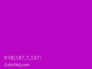 RYB 187,7,197 Color is a normal magenta color and the nearest color is Deep Magenta #cc00cc. Hex code #bb07c5 and RGB value is rgb(187,7,197). In RGB color space, this color is composed of 73% red, 3% green, 77% blue, In CMYK color space, this color is composed of 5% cyan, 96% magenta, 0% yellow , 23% black , In HSL color space, this color has a hue angle of 297° , 93% saturation and 40% lightness.