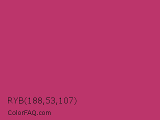 RYB 188,53,107 Color is a normal rose color and the nearest color is Hibiscus #b6316c. Hex code #bc356b and RGB value is rgb(188,53,107). In RGB color space, this color is composed of 74% red, 21% green, 42% blue, In CMYK color space, this color is composed of 0% cyan, 72% magenta, 43% yellow , 26% black , In HSL color space, this color has a hue angle of 336° , 56% saturation and 47% lightness.