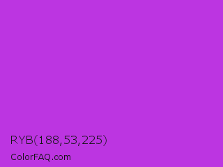 RYB 188,53,225 Color is a normal purple color and the nearest color is Steel Pink #cc33cc. Hex code #bc35e1 and RGB value is rgb(188,53,225). In RGB color space, this color is composed of 74% red, 21% green, 88% blue, In CMYK color space, this color is composed of 16% cyan, 76% magenta, 0% yellow , 12% black , In HSL color space, this color has a hue angle of 287° , 74% saturation and 55% lightness.
