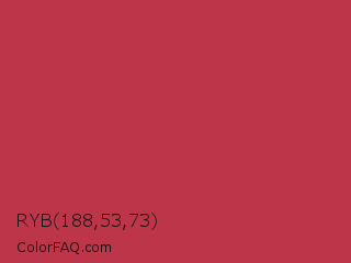 RYB 188,53,73 Color is a normal red color and the nearest color is Dingy Dungeon #c53151. Hex code #bc3549 and RGB value is rgb(188,53,73). In RGB color space, this color is composed of 74% red, 21% green, 29% blue, In CMYK color space, this color is composed of 0% cyan, 72% magenta, 61% yellow , 26% black , In HSL color space, this color has a hue angle of 351° , 56% saturation and 47% lightness.