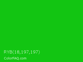 RYB 18,197,197 Color is a normal green color and the nearest color is Vivid Malachite #00cc33. Hex code #12c512 and RGB value is rgb(18,197,18). In RGB color space, this color is composed of 7% red, 77% green, 7% blue, In CMYK color space, this color is composed of 91% cyan, 0% magenta, 91% yellow , 23% black , In HSL color space, this color has a hue angle of 120° , 83% saturation and 42% lightness.