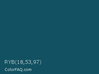 RYB 18,53,97 Color is a dark cyan color and the nearest color is Deep Sea Green #095859. Hex code #125161 and RGB value is rgb(18,81,97). In RGB color space, this color is composed of 7% red, 32% green, 38% blue, In CMYK color space, this color is composed of 81% cyan, 16% magenta, 0% yellow , 62% black , In HSL color space, this color has a hue angle of 192° , 69% saturation and 23% lightness.