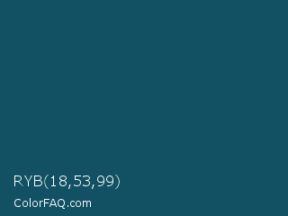 RYB 18,53,99 Color is a dark blue color and the nearest color is Deep Sea Green #095859. Hex code #125063 and RGB value is rgb(18,80,99). In RGB color space, this color is composed of 7% red, 31% green, 39% blue, In CMYK color space, this color is composed of 82% cyan, 19% magenta, 0% yellow , 61% black , In HSL color space, this color has a hue angle of 194° , 69% saturation and 23% lightness.